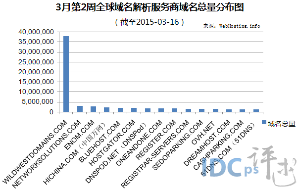 IDC評述網(idcps.com)03月23日報道:據WebHosting.info公布的最新數據顯示,在3月第2周,WILDWESTDOMAINS.COM以域名總量37,836,745個打敗全球眾多域名商,凈增86,588個,漲幅最大。另外,在前十五強中,中國占據3個席位,分別是中國萬網、DNSPod與51DNS。下面,請看詳盡的數據分析。
