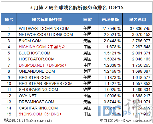 3月第2周全球域名商TOP15:中國占據3個席位