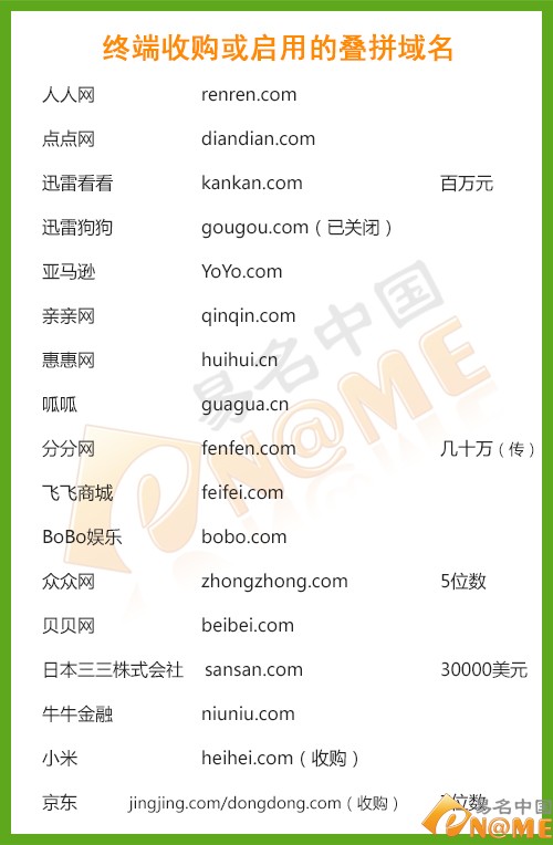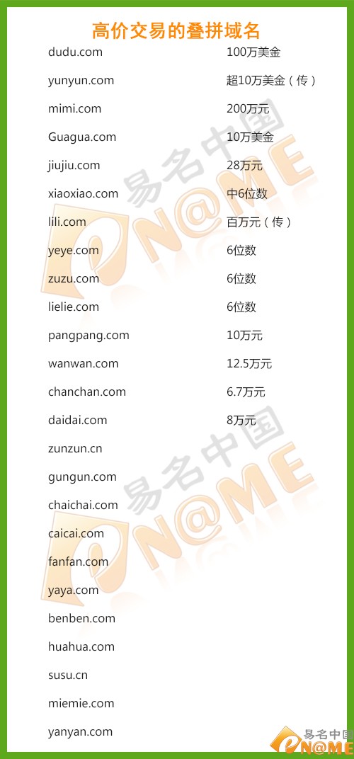 在域名交易市場中,疊拼域名的行情一向被看好。域名dudu.com就曾于2012年年初以100萬美金的價格結拍,位居當周Sedo榜單第一名。當時的買家為海外知名社交網站DUDU,賣家則是千橡集團的陳一舟。