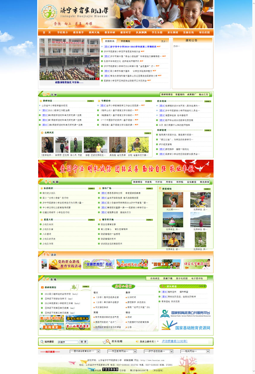 2014年3月6號,濟寧市霍家街小學委托我司全新改版設計校園網:www.huoxiao.com 技術部首席設計師馬麗娜接到公司委派,第一時間與校電教組、教務處、校辦分管領導溝通調研,得到他們的大力支持和配合。她本人參與網站的美工設計,欄目規劃,內容充實完善,得到校領導一直好評,并榮獲“2014年山東省優秀教育網站評選活動二等獎”。